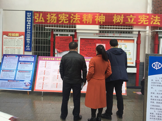 12月4日,汨罗市信访局深入汨罗镇蟠龙桥村,以悬挂宣传横幅、发放宣传资料、摆放宣传展板、提供法律咨询的方式,开展宪法宣传活动以及“共建共享法治汨罗”签名活动,让宪法宣传入村入户,增强全民宪法意识和法治观念。