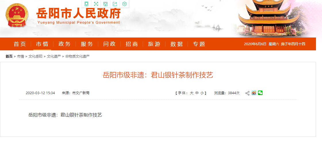 君山银针茶制作技艺(黄茶制作技艺)是不是非物质文化遗产?是岳阳市市级非物质文化遗产,还是湖南省省级非物质文化遗产呢?能否告知相关公告、文件在哪查询。 附件1:岳阳市级非遗君山银针.png |