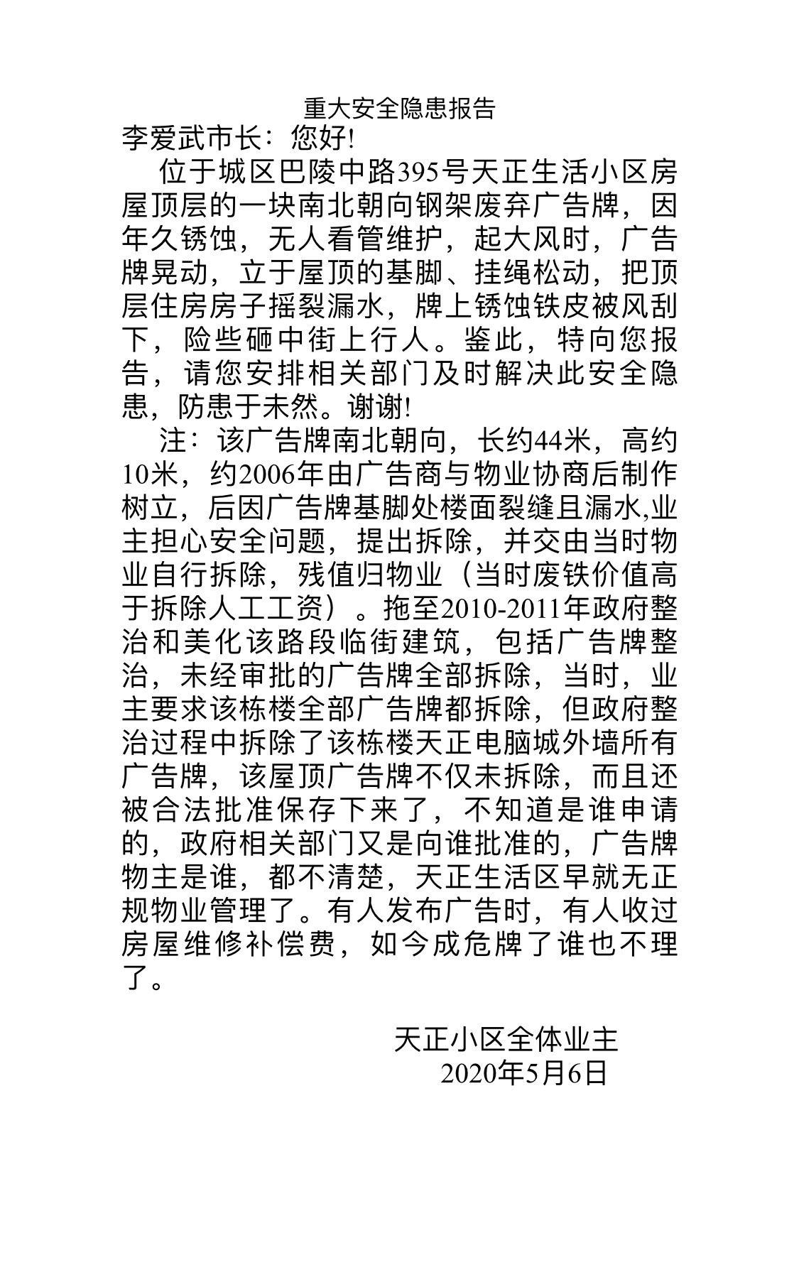 该信中涉及的巴陵中路天正电脑城屋顶广告安全隐患问题,我局广告科已到现场勘察,该广告牌已过审批期限,我局将尽快组织拆除,已避免安全隐患。