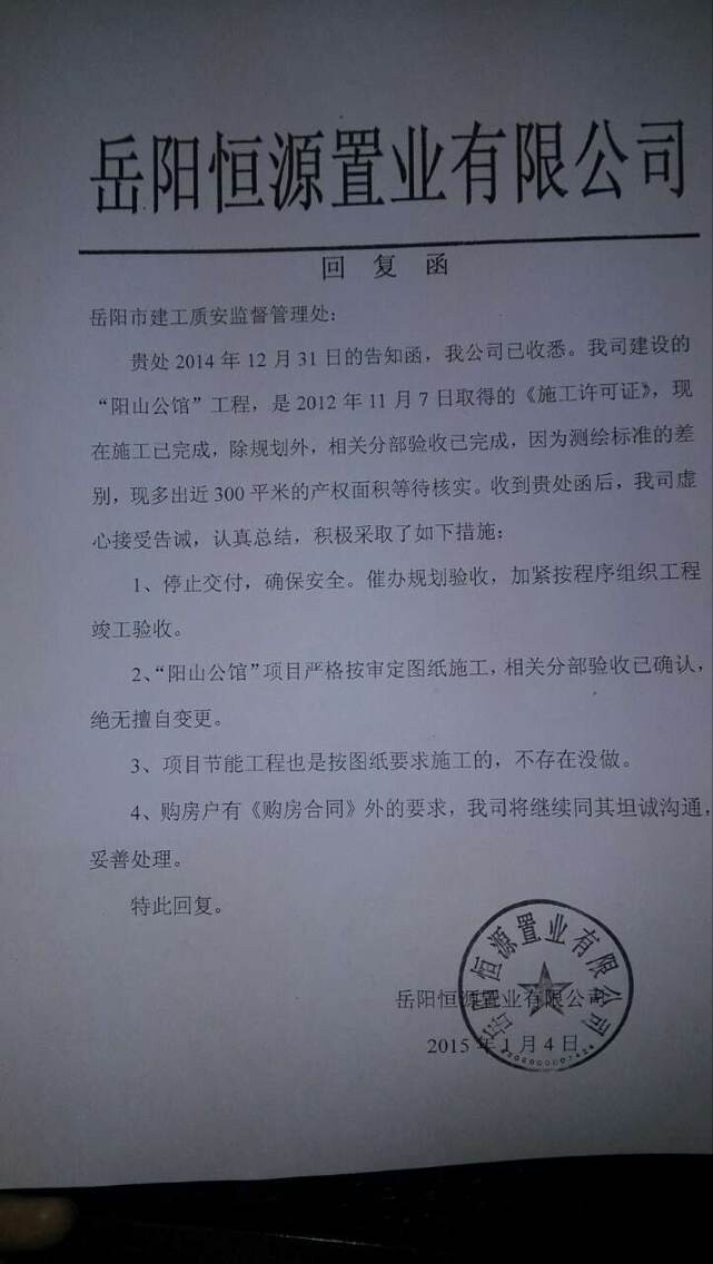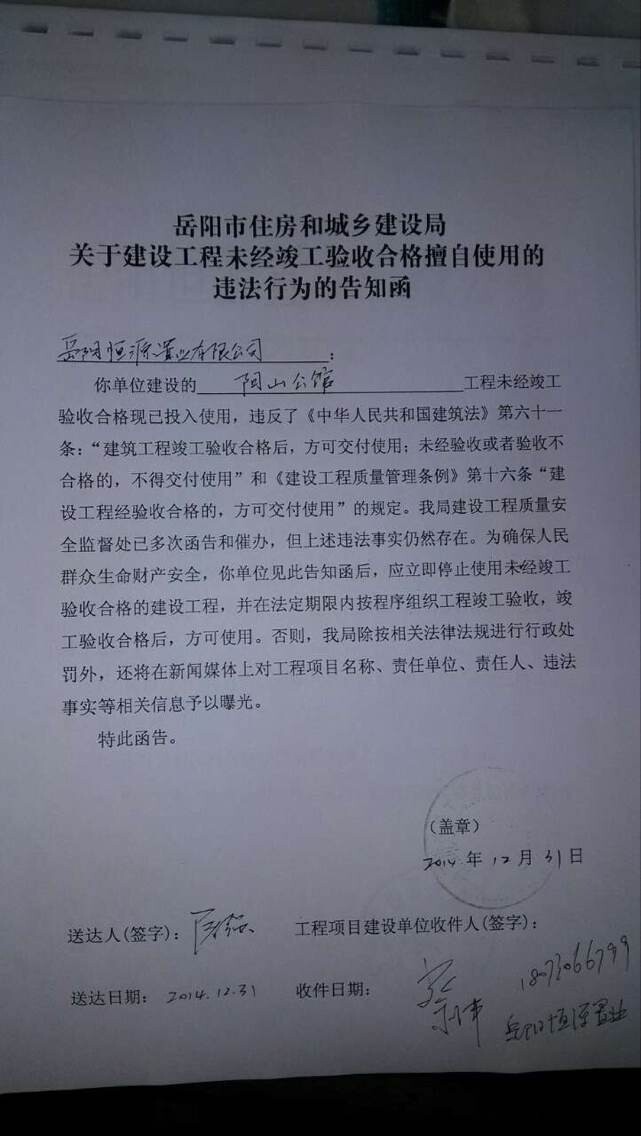 经安排市建设工程质量安全监督处调查,联系该项目建设单位负责人,核实了您来信中反映的问题,并于当日签发了《关于建设工程未经竣工验收合格擅自使用的违法行为的告知函》,要求建设单位对存在的问题进行整改并回复。建设单位于2015年1月4日进行了回复,我们将继续做好跟踪监管,若有相关疑问或咨询事项,欢迎您到市建设工程质量安全监督处问询。地址:岳阳市住房和城乡建设局北院(巴陵中路)临街办公楼五楼。
